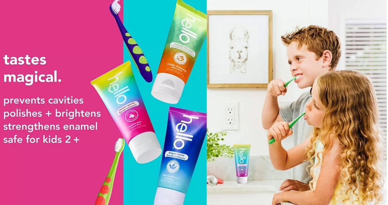 Hello Kids Toothpaste and Toothbrush có chứa fluoride, phù hợp cho trẻ từ 2 tuổi trở lên.